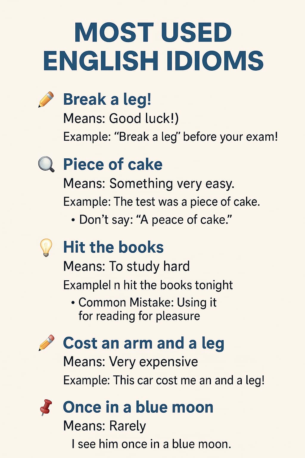 ✅ MOST USED ENGLISH IDIOMS 📝 Break a leg! (Means: Good luck!) Example: “Break a leg” before your exam! 🔍…