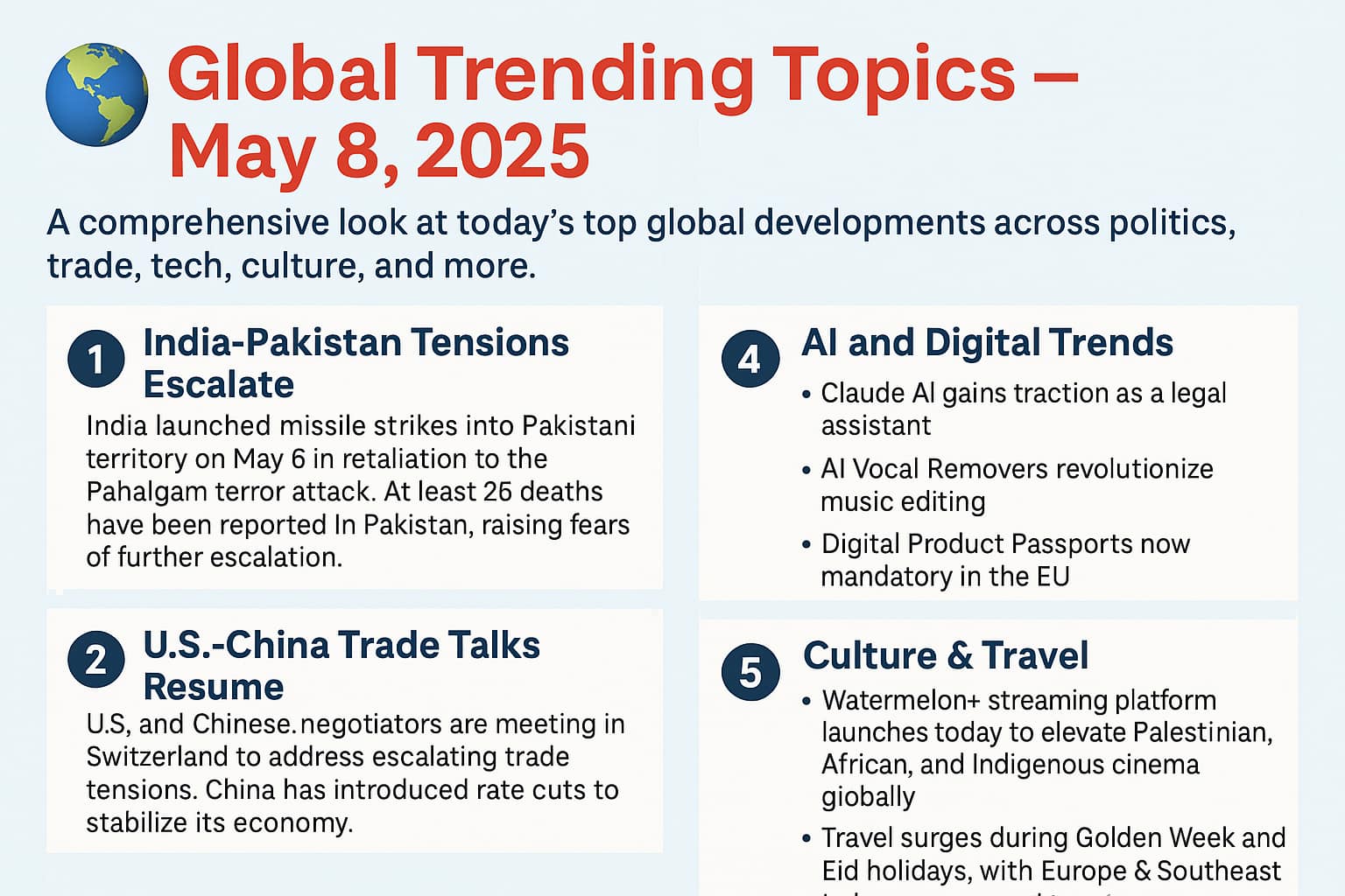 🌍 Global Trending Topics – May 8, 2025 A comprehensive look at today’s top global developments across politics, trade, tech,…