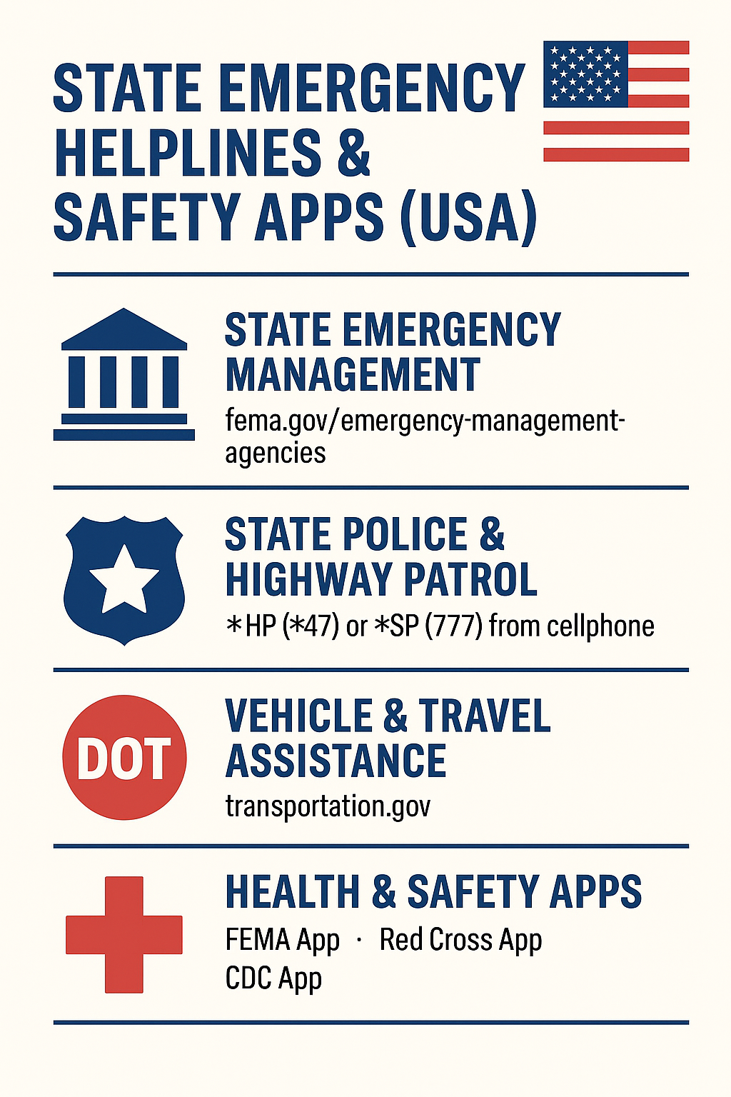 Find official state emergency helplines, disaster management offices, and preparedness tips across the USA. Includes FEMA resources, highway patrol contacts,…