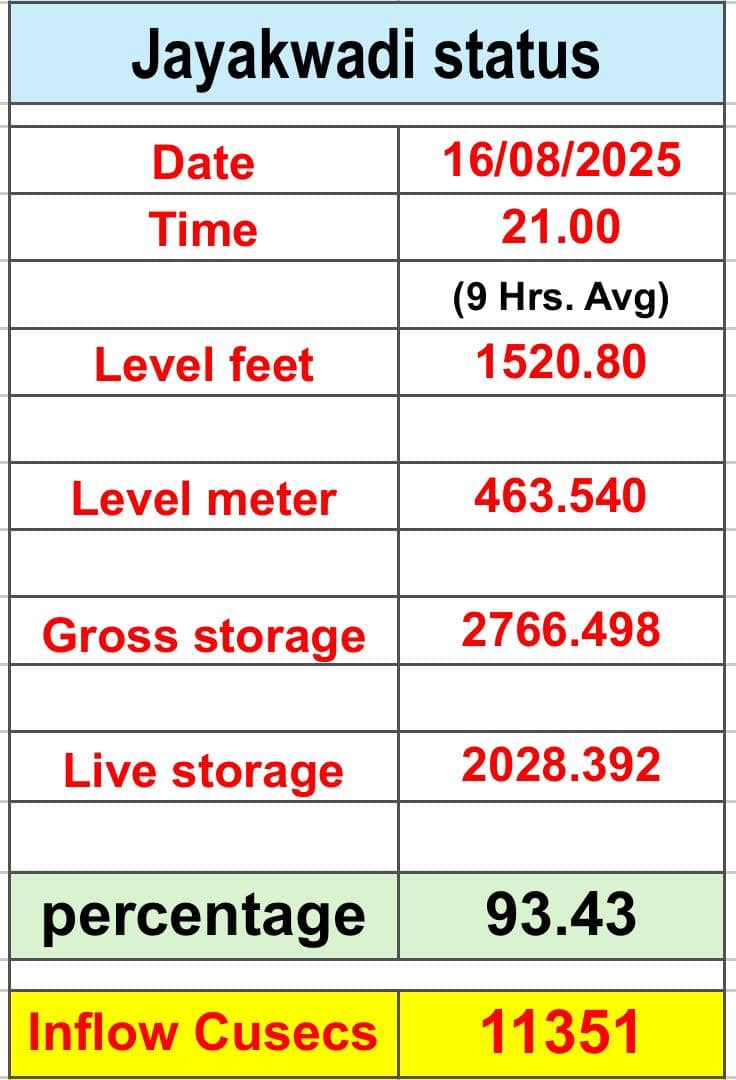 जयकवाड़ी बांध 93.43% तक भरा — 11,351 क्यूसेक आवक जारी जयकवाड़ी बांध 93.43% तक भरा — 11,351 क्यूसेक पानी की…